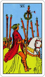 Шестерка Жезлов символизирует победу, славу и триумф. Эта карта указывает на то, что вы успешно достигли всего, чего когда-либо желали, и благодаря этому получаете признание, которого действительно заслуживаете. Благодаря вашим результатам вы получаете публичное признание и становитесь обладателем славы. Эта карта означает, что вы уже получили или скоро получите какую-либо награду или что-то эквивалентное ей за свой успех.